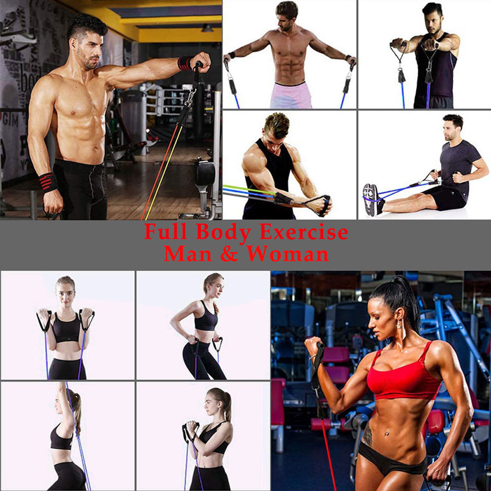 Set sadrži 5 elastičnih traka za vježbanje (žuta, zelena , crvena , plava i crna-ukupnog opterećenja od 50kg), 2 velike ručke, 2 kaiša za gležnjeve, 1 fiksator (sidro) za vrata + GRATIS torbica za čuvanje. Naša transportna torbica nudi idealan način za odlaganje kompleta i nošenje sa sobom u svakodnevnom životu.