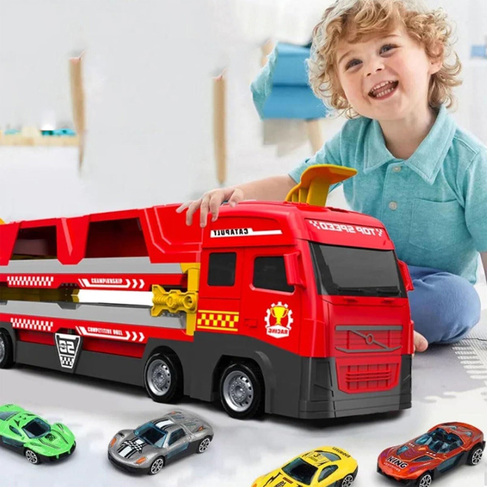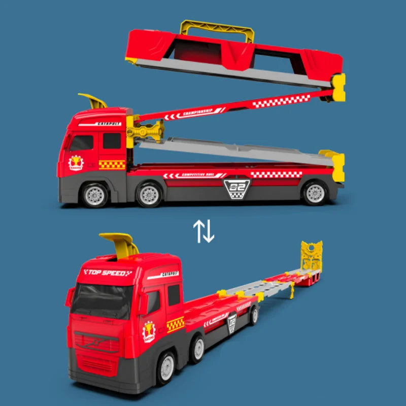 Džinovski transportni kamion sa katapultnom stazom drži više malih automobila! Djeca mogu utovariti svoje omiljene male automobile u kolica za skladištenje katapulta na stazi i lako ih sklopiti