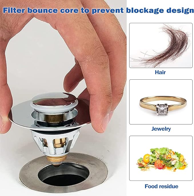 Nadograđeni odvodni čep od nerđajućeg čelika Bounce Core Push-Type ima korpu protiv začepljenja koja sprečava da se kanalizacija zaglavi u kosi.