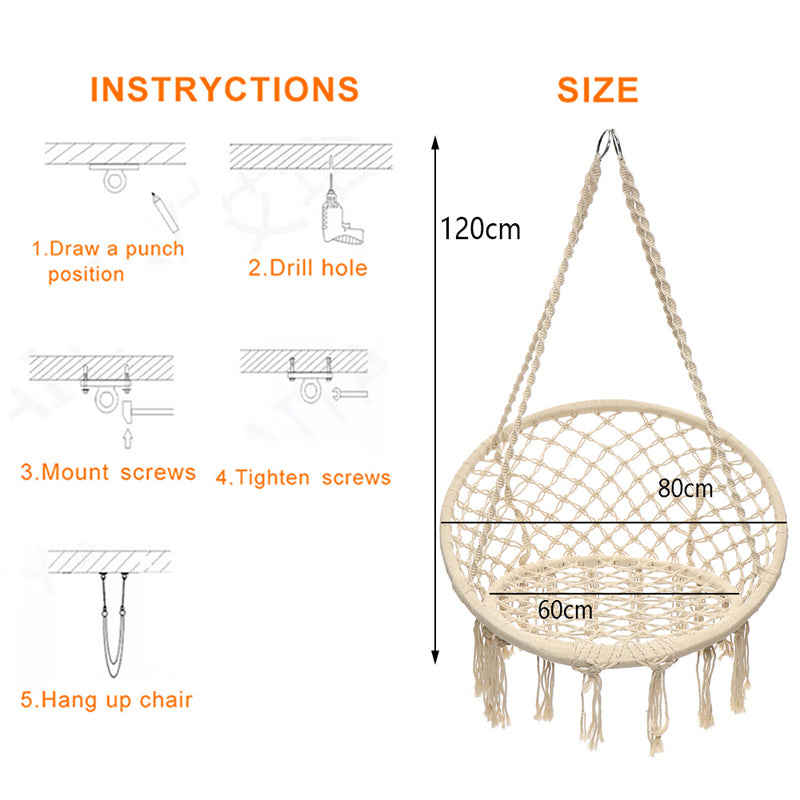 ✅ Dimenzije: Prečnik sedišta ~60 cm | Visina kačanja ~130 cm (možeš prilagoditi po potrebi).